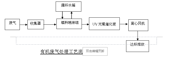 公司通過實地考察及承接同類工程積累經(jīng)驗,決定采用填料式噴淋塔對廢氣中的滑石粉進行預(yù)處理,預(yù)處理后廢氣進入UV光氧催化裝置對有機物進行深度凈化處理。具體工藝流程如下: